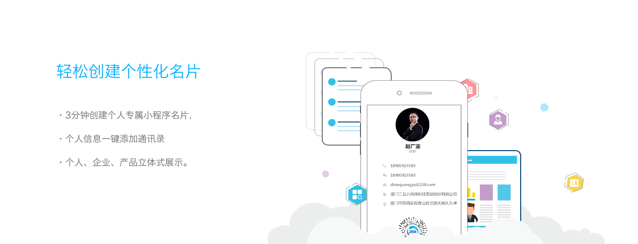 可以幫你實現3分鐘輕松創建專屬個性化小程序名片,個人信息一鍵添加通訊錄,個人、企業、產品全方位展示。AI智能【超級名片】讓你從此告別手機拍名片,陌拜、會議、展會等,打開二維碼即可瞬間將名片“遞”給上千人,展示企業實力,突出產品優勢,讓銷售更“靠譜”。同時利用社交小程序連接10億用戶,一鍵轉發至微信好友、微信群,線下物料印刷二維碼,實現O2O閉環,客戶掃一掃信息即記錄在案,便捷連接。